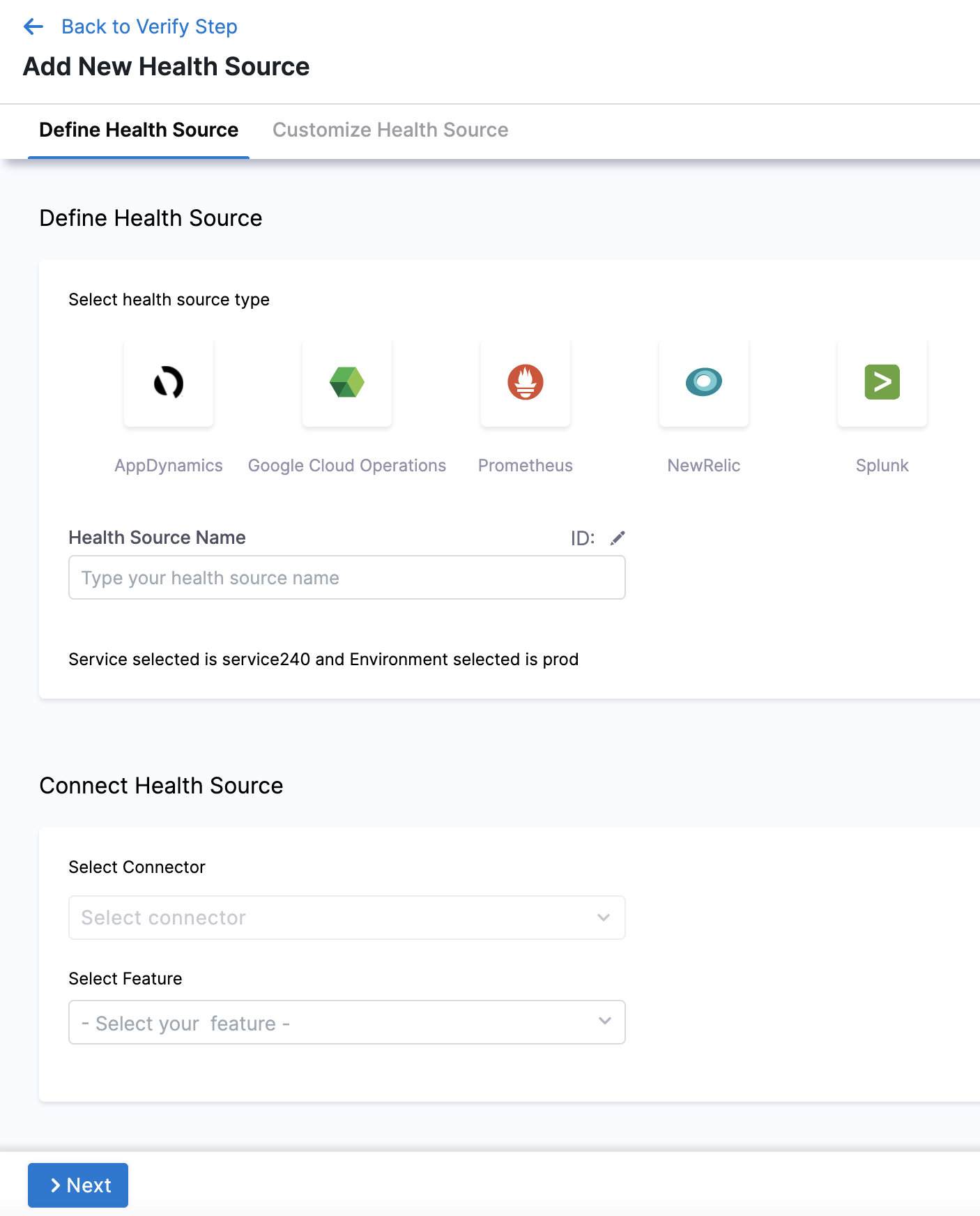 Click Next. The Customize Health Source settings appear. The subsequent settings in Customize Health Source depend on the Health Source Type you selected. You can customize the metrics to map the Harness Service to the monitored environment.