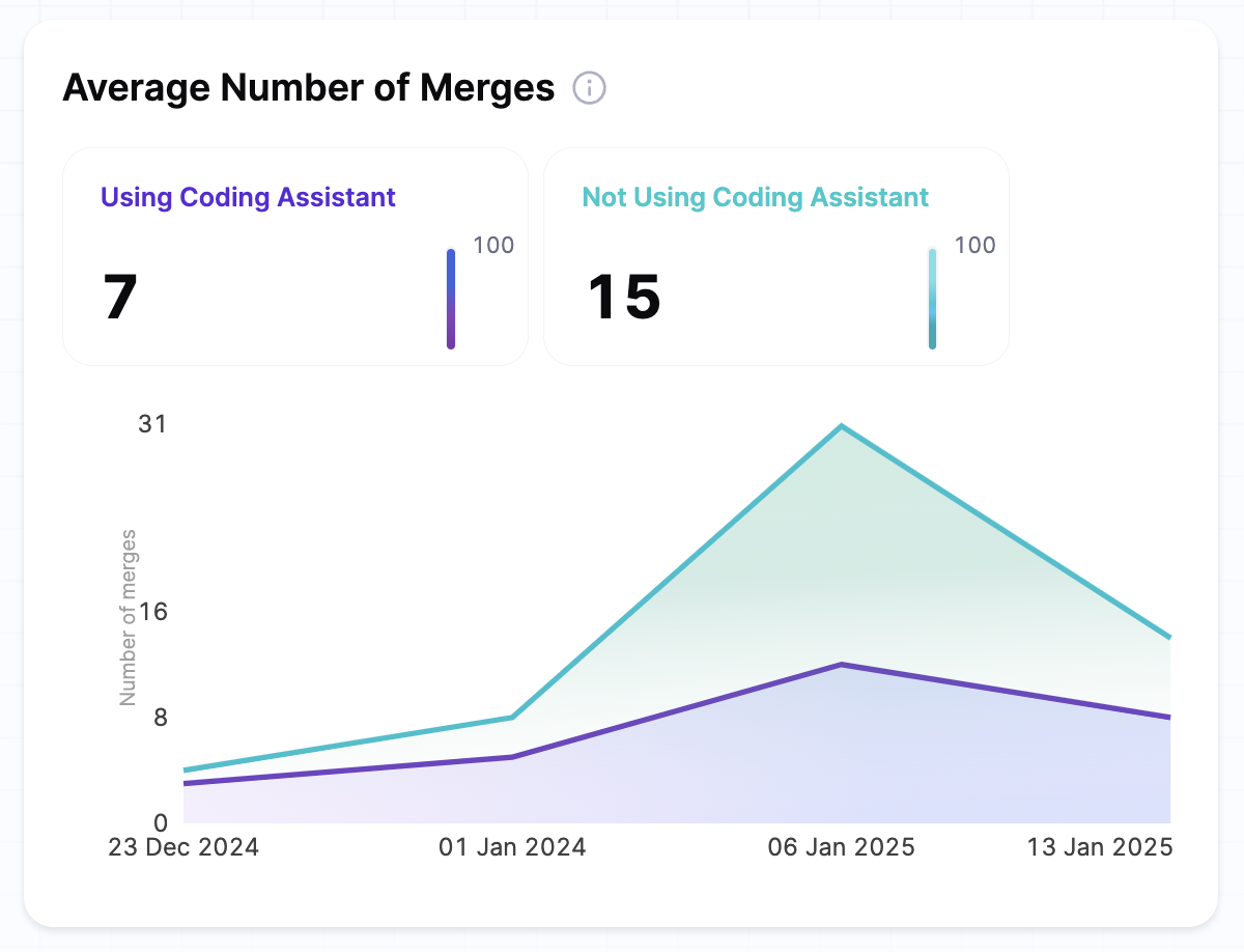 - If developers using AI tools have a higher average number of merges per week, it suggests that AI-assisted development is enabling faster integration of code, helping teams move quicker through the review and merge process.