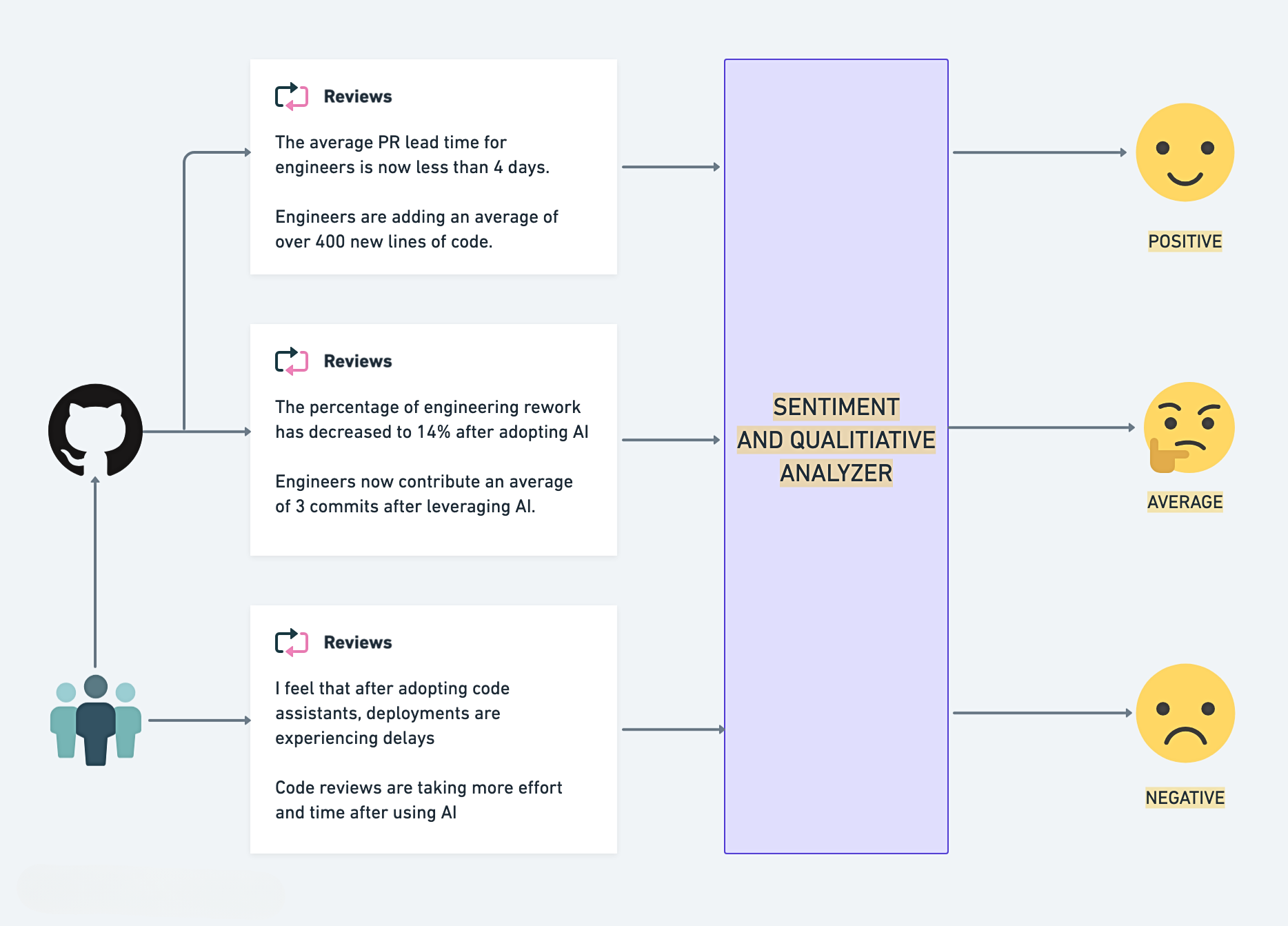- Understand developer experience: Gather qualitative feedback and sentiment data to evaluate how AI tools enhance or hinder satisfaction and innovation.
