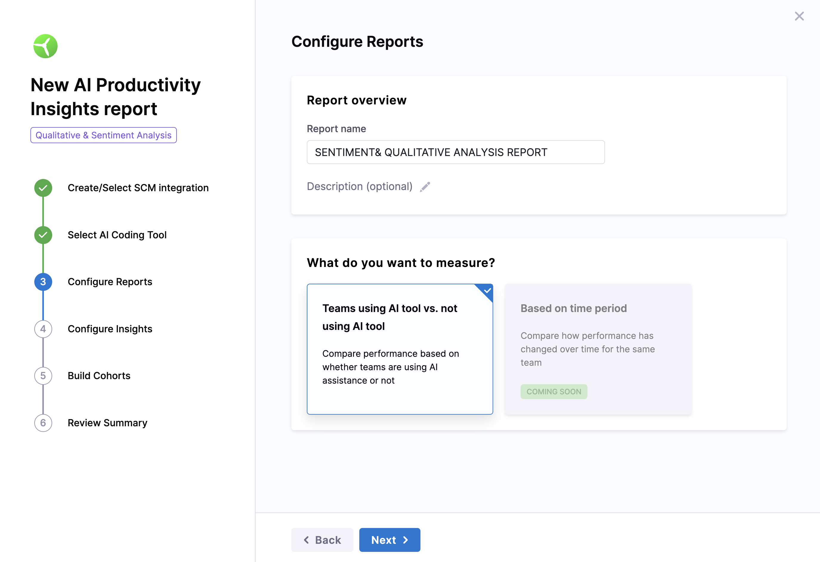 - Note that the support for assessing how the performance of the same team changes over a specified time period, such as before and after implementing an AI tool is currently not available but will be added in the future.