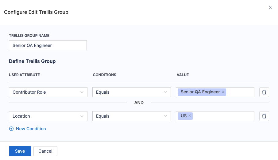 - You can configure multiple conditions to define the matching criteria for the Trellis Groups.