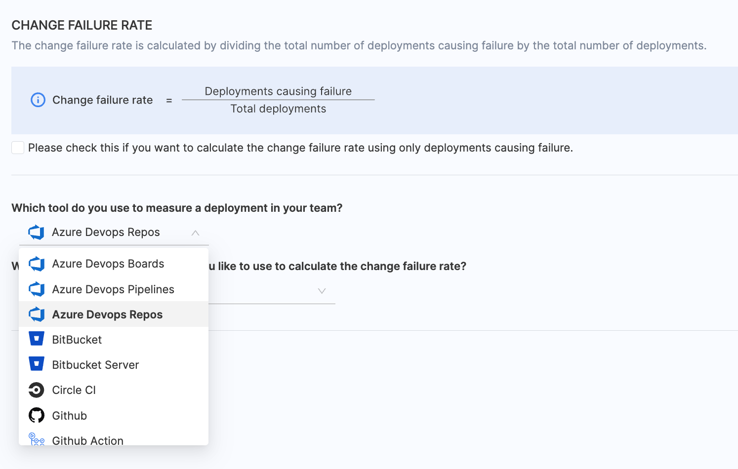 - Choose BitBucket / BitBucker Server as the tool that you use to measure change failure rate in your team.