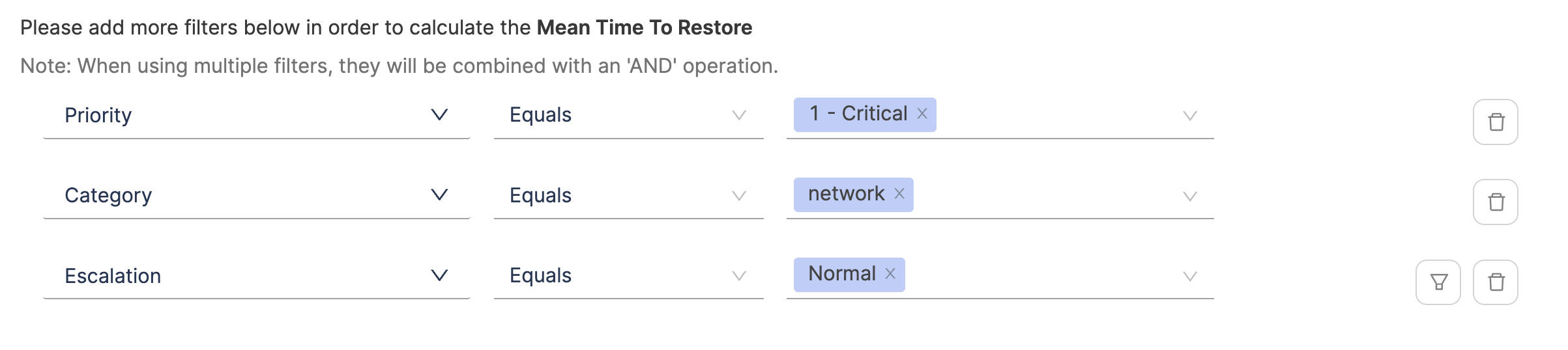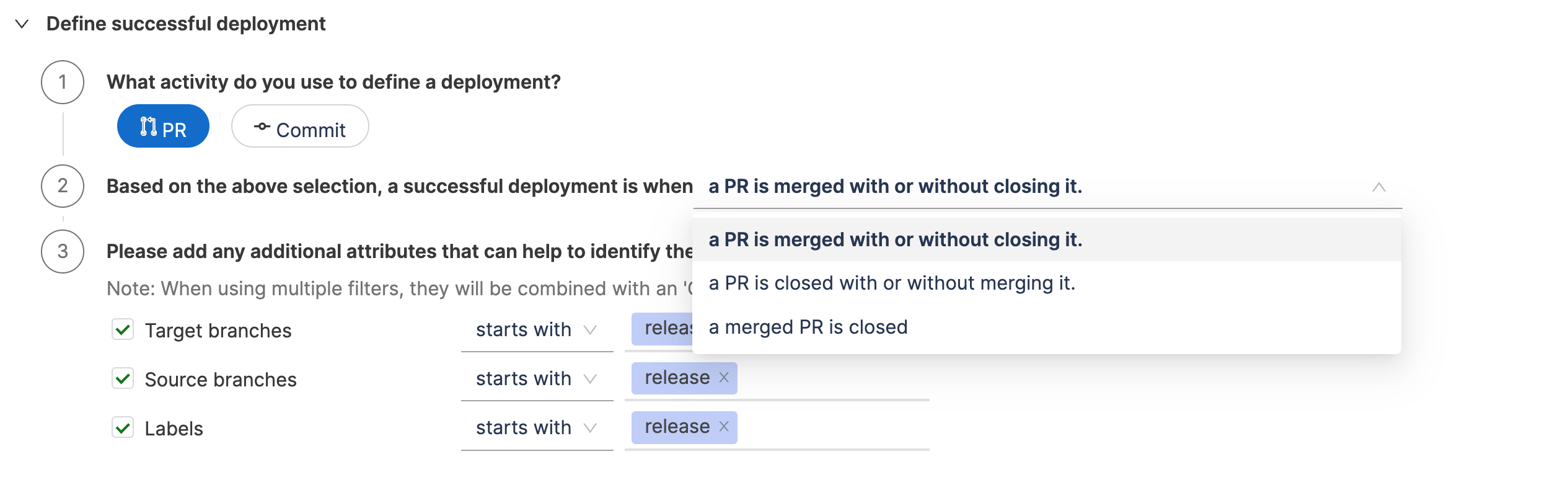- Define additional attributes to identify deployments causing failure and total deployments. When using multiple filters, they will be combined with an 'AND' operation.