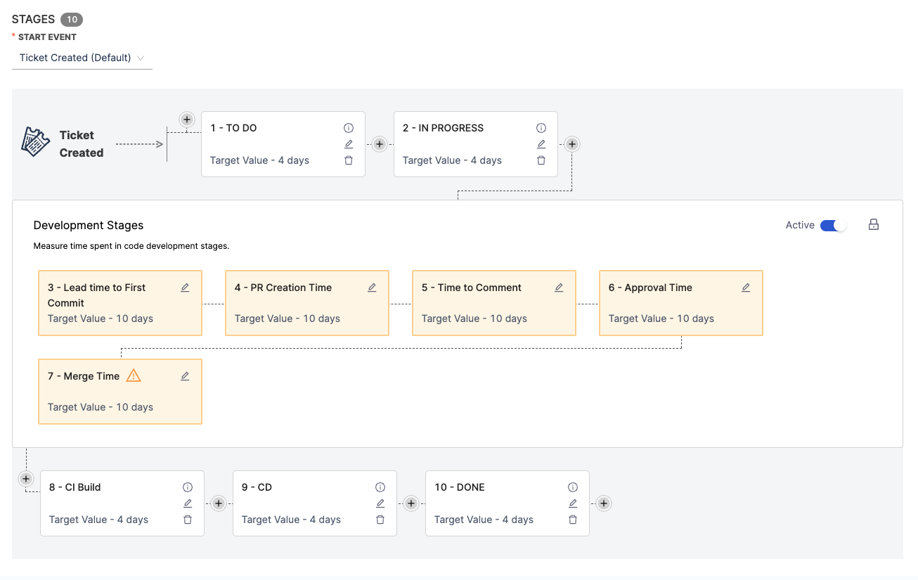 - The workflow definition includes pre-configured development stages based on SCM activity, such as PR Creation Time, Time to Comment and more.
