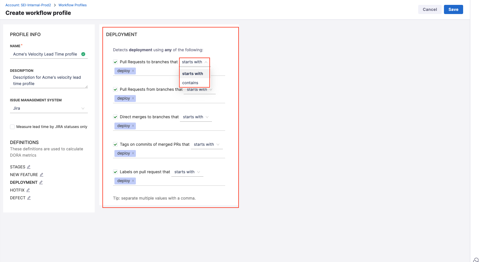 You can customize Workflow profile stages and thresholds to align with your team's Software Development Lifecycle (SDLC) processes. For profiles involving multiple tools like issue management, SCM, and CI/CD, avoid duplicate tracking of the same event (e.g., Deploy to Production in both Jira and CI/CD).