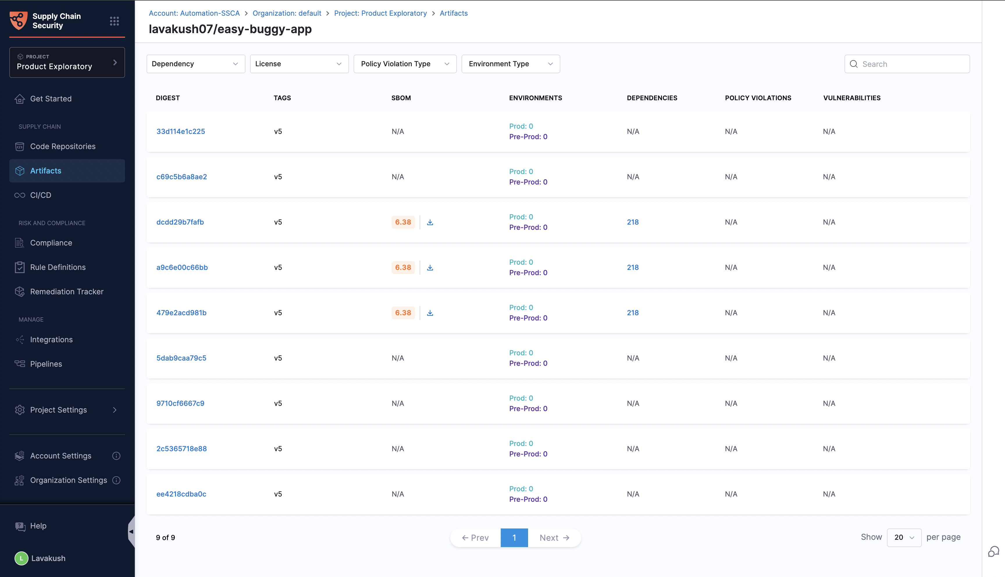 You can search for a specific digest or apply filters based on dependencies, licenses, policy violations, and environment types to quickly find the required data.