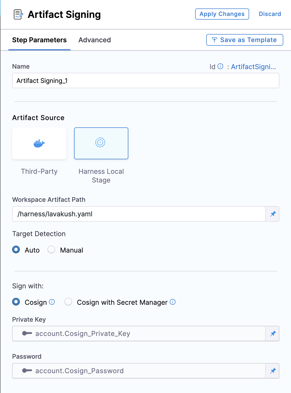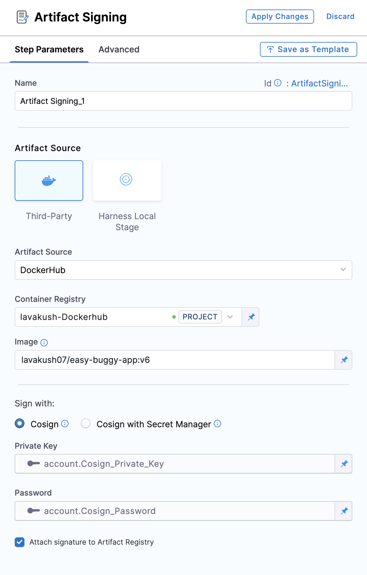 The Artifact Signing step allows you to sign your artifacts and optionally push the generated signature file .sig to the same artifact registry from which the artifact was retrieved.