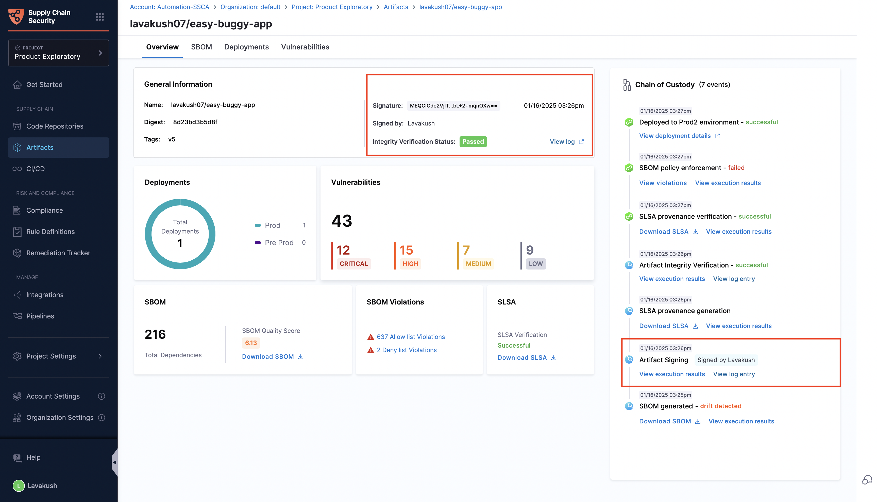 You can easily access the signed artifact details from the Artifacts Overview tab. This section shows the signature and who signed the artifact. Additionally, you can also find the artifact signing as an event in the Chain of Custody, where a new entry is logged every time you sign an artifact.This entry includes a link to the execution results and rekor log entry, allowing you to track the signing activity and cross-check the details.