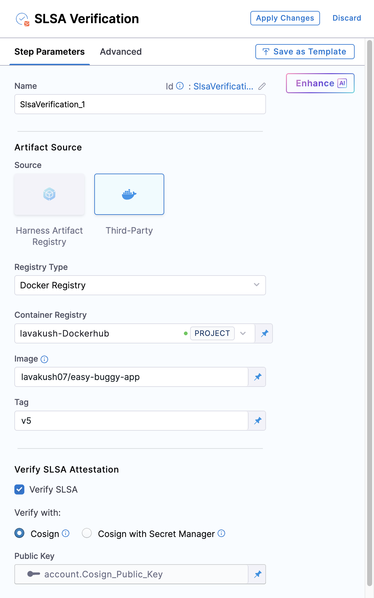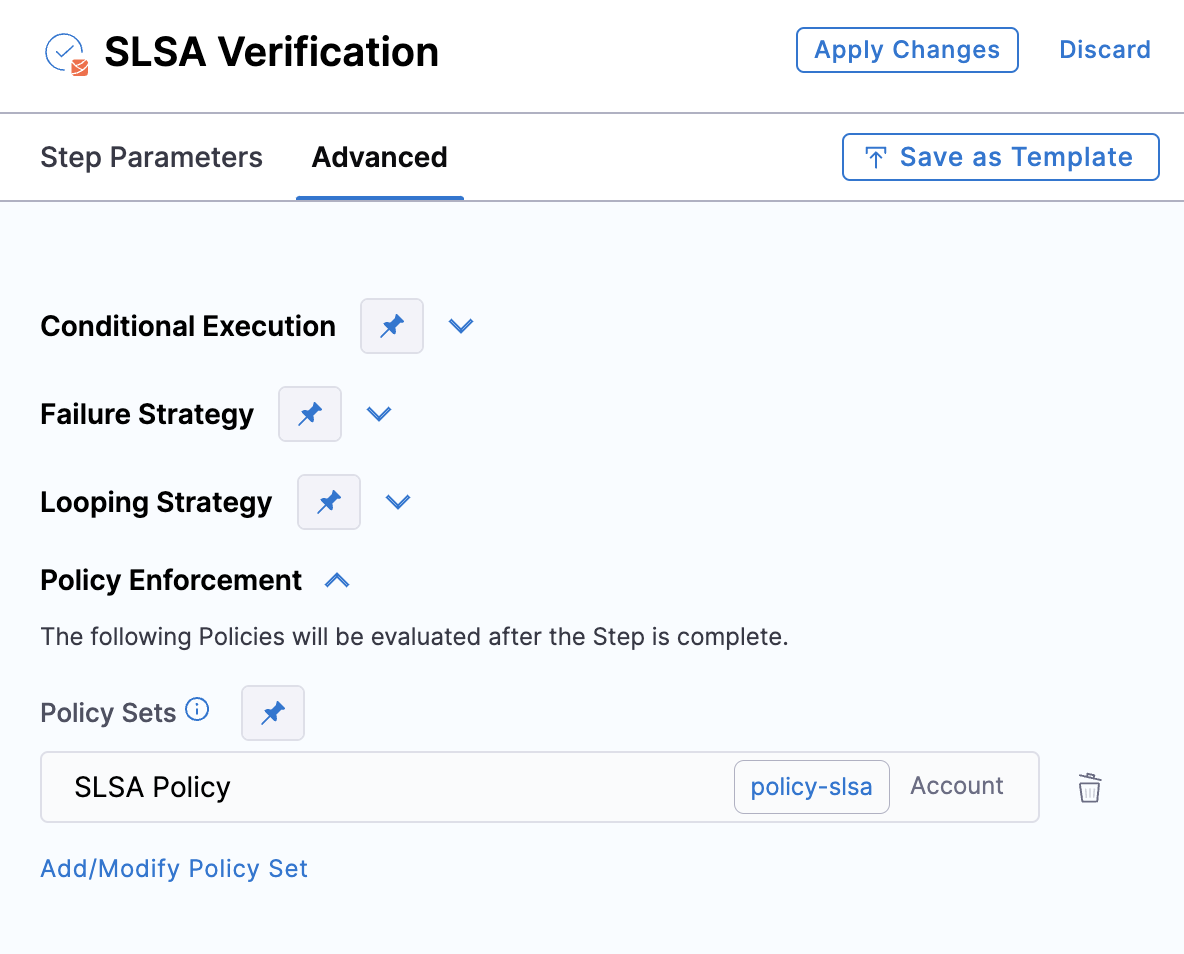 To enforce policies, navigate to the Advanced tab of the SLSA Verification step, expand the Policy Enforcement section, and specify the policy sets you wish to enforce.