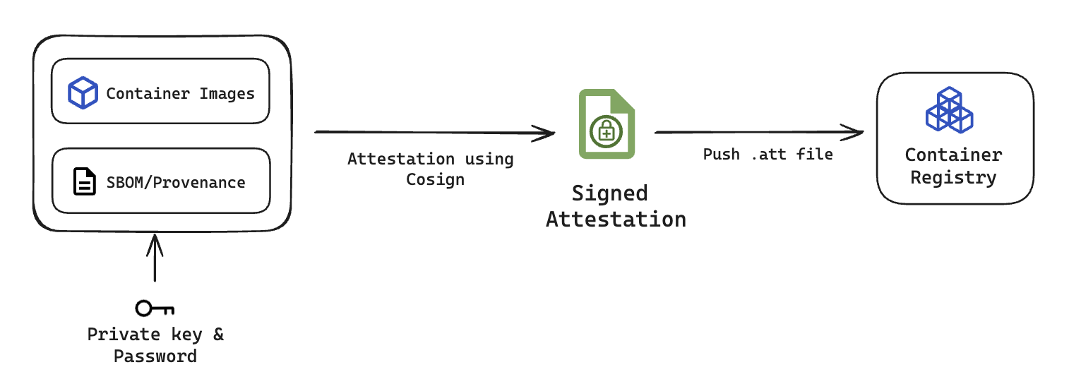 For verification, the signed attestation is retrieved from the container registry and verified using the corresponding public key. This public key should be of the same key pair where the attestation was signed using the private key.