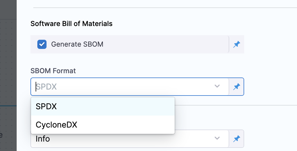 Configure an STO scanner step, such as the Aqua Trivy STO step, and make sure you select Generate SBOM and the SBOM Format.