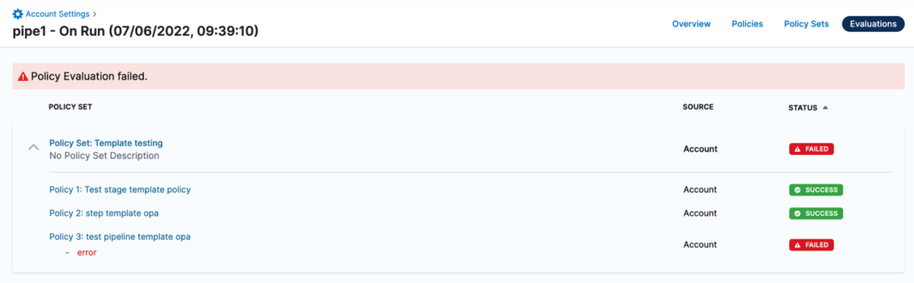 If a Harness policy engine policy set is enabled and your pipeline or other resource does not pass the set, a message similar to the following is displayed: