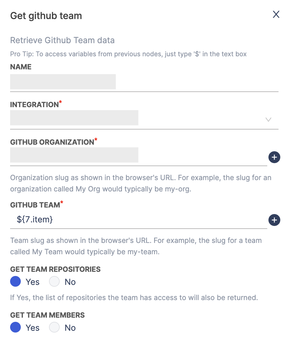 - Add a node to connect to the third-party tool (e.g., GitHub) and retrieve team data.