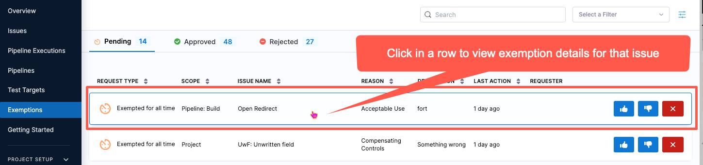 You can click on a row in the Exemptions table to view details for the issue associated with that exemption.