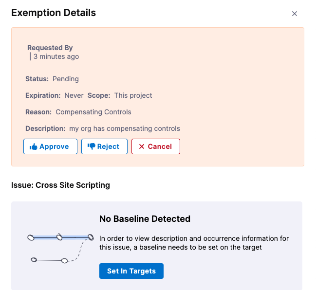 For best results in STO, you should specify a baseline for every target. To encourage this, the Exemption Details pane hides details for an issue if there is no baseline detected. To specify the baseline, select Set in Targets.